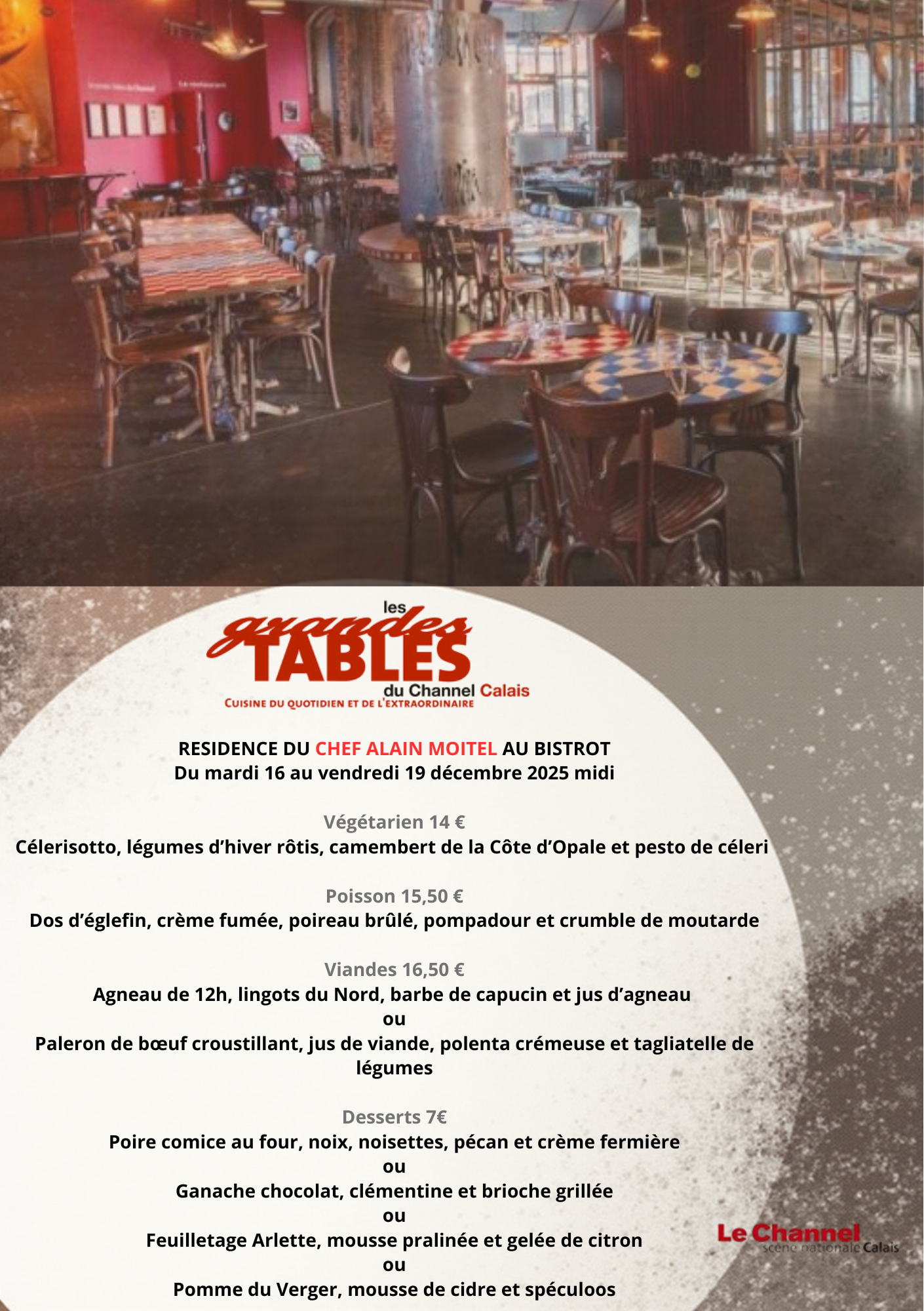 Pendant seize ans, il a été le chef du restaurant des grandes Tables du Channel. Ses premières années ici ont été guidées par le chef étoilé Alexandre Gauthier. Fort de cette expérience, Alain Moitel a ensuite incarné une cuisine exigeante, simple et raffinée. Le moment est venu pour lui de prendre sa retraite, il vous invite à goûter sa carte spéciale au bistrot et son menu « signature » au restaurant.